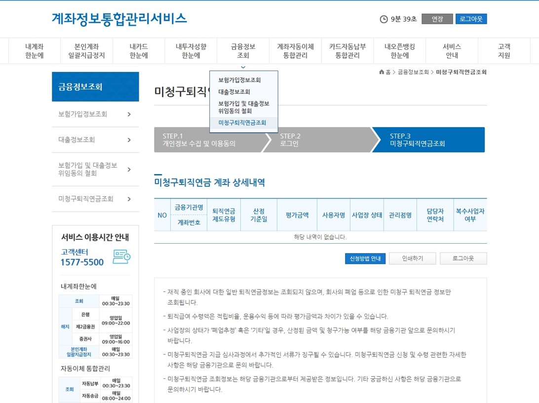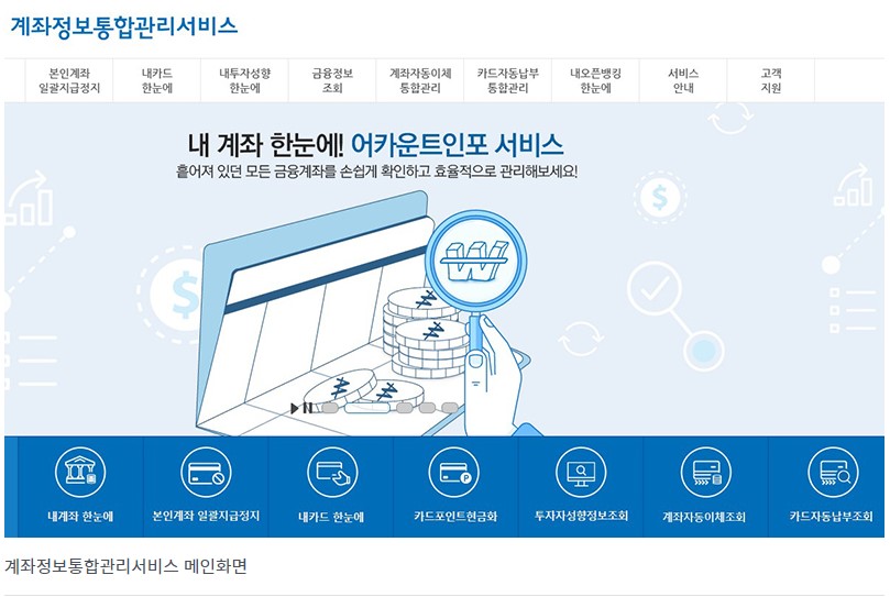 계좌정보통합관리서비스는 고용노동부, 금융위원회, 금융감독원 등의 관계부처가 본인의 은행, 보험, 상호금융, 대출, 카드발급 정보 및 자동이체 등록정보 등을 일괄 조회할 수 있도록 만든 서비스입니다. 이 서비스는 이제 미청구 퇴직연금 조회 기능도 제공합니다.